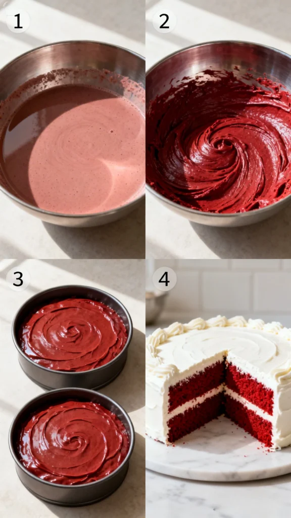 Now you add the red food coloring. You will see the batter change color. Slowly add the dry mix to the wet mix. Stir gently so your red velvet cake recipe stays soft.
